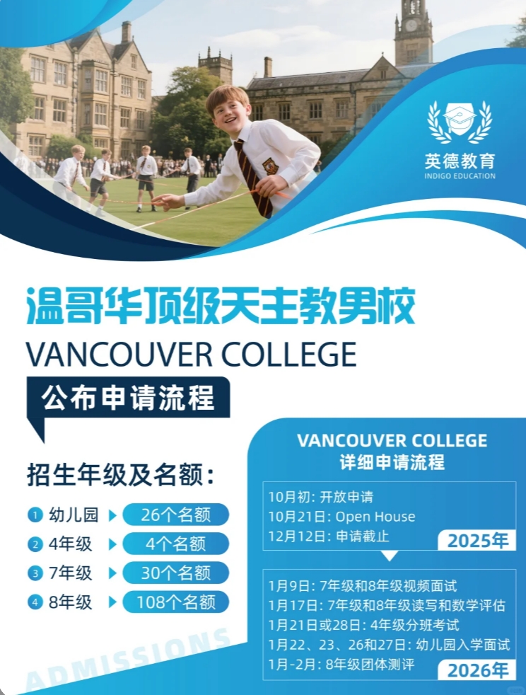 这所已有百年历史的BC省唯一私立天主教男校,不仅在学术领域持续稳健,更以卓越的体育实力和深厚的教育使命感闻名。对众多家长而言,每年的申请周期都是一场激烈竞争,而今年的申请流程也正式拉开序幕。 一、2026-2027学年招生年级与名额分布 根据Vancouver College最新公布的信息: 幼儿园(Kindergarten):26个名额 四年级(Grade 4):4个名额 七年级(Grade 7):30个名额 八年级(Grade [...]